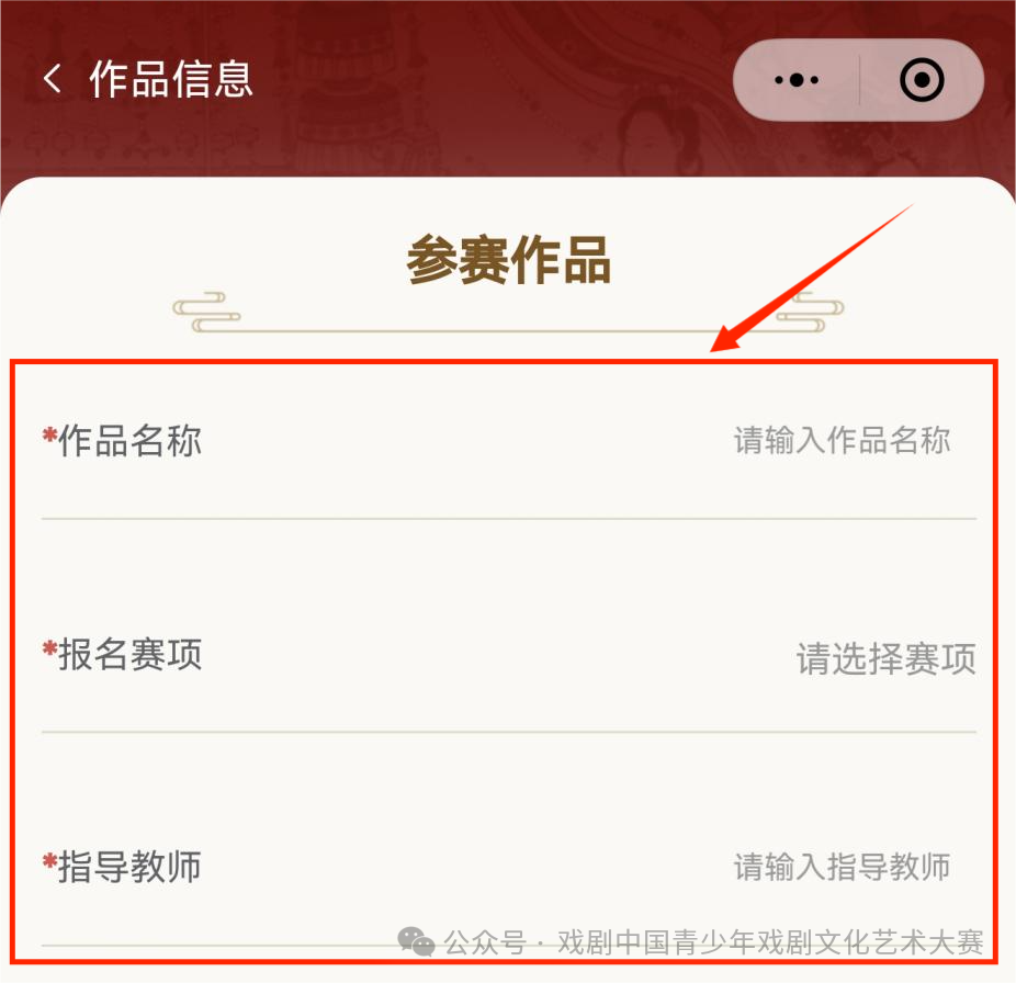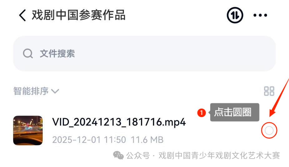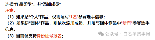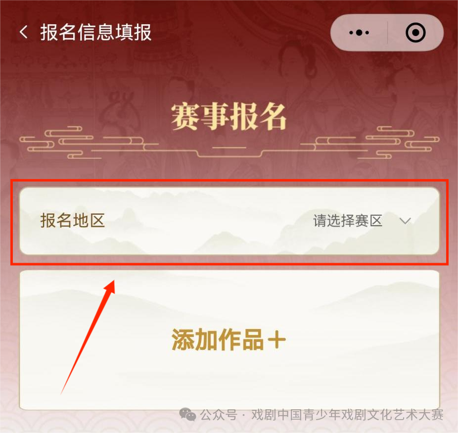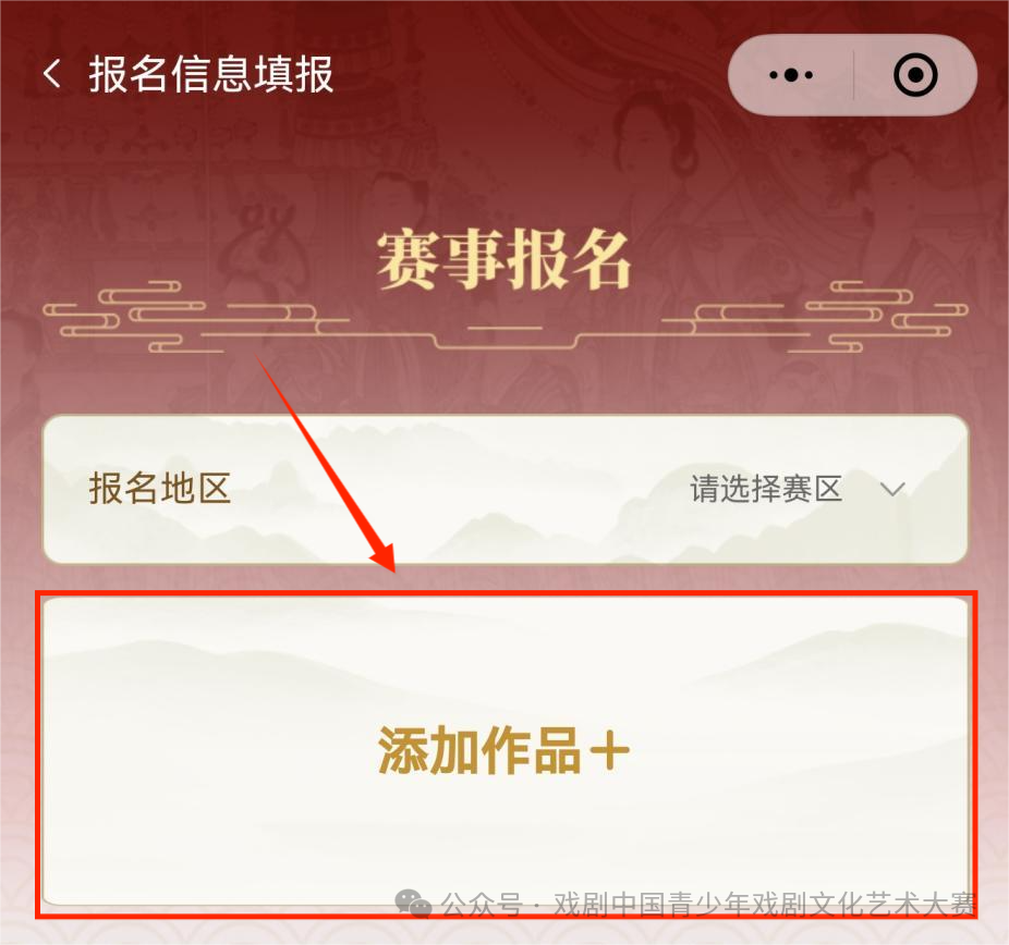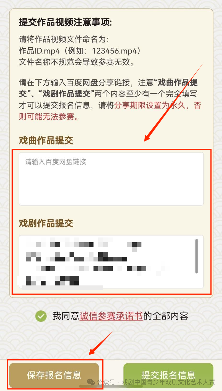 个人报名仅针对单个作品报名使用 每人每赛项仅限报名一个作品 01 选择“参赛报名” 02 首次登录,选择“立即登录”,并授权获取手机号 03 进入报名界面,选择底部“立即报名” 04 进入报名界面,选择“报名地区” 注意: 报名地区为参赛选手所在赛区,请谨慎选择,一经确认,无法修改。 05 选择“添加作品+”,填写报名信息 06 填写参赛作品信息 07 08 点击“保存报名信息”,获取“作品文件名称”,按提示,将作品视频文件重命名为指定名称 09 10 分享作品视频文件,复制分享链接 注意: 分享链接有效期设置“永久有效”,打开“分享链接自动填充提取码” 11 将作品分享链接,粘贴至报名小程序 注意: 粘贴时,正确选择粘贴区域,按照报名作品赛项粘贴 12