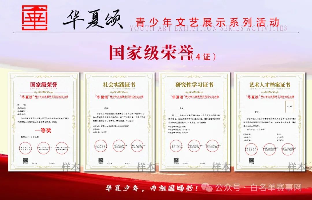 为深入贯彻落实中共中央办公厅、国务院办公厅《关于全面加强和改进新时代学校美育工作的意见》,大力发展素质教育,强化美育的育人功能,华夏文化促进会素质教育委员会特举办“华夏颂”青少年文艺展示系列活动。 本次活动旨在通过丰富多彩的文艺形式,全方位点燃青少年对祖国的热爱,深度激发他们的爱国情怀,全面提升其艺术审美、语言表达、知识储备、团队协作等综合素养,助力他们成长为有担当、有情怀的新时代青年。 1.指导单位 华夏少年,为祖国喝彩! 幼儿组(6岁及6岁以下) 活动分初评和总评选两个环节,通过初评的作品可获得参与活动总评选的资格 每月25日前完成作品提交客服 初评时间:2025年3月10日至2026年2月28日 总决选时间:2025年7月1日至2026年2月28日 扫码参与活动 A类:书画作品 1、图片文件:RGB模式,JPG格式等均可,拍照上传。 2、视频文件:视频时长不超过5分钟,要求画面清晰且完整,声音清晰可闻。 省级荣誉 金奖、银奖、铜奖、优秀奖 国家级荣誉 一等奖、二等奖、三等奖、优秀奖 注意:对指导参选获奖作品达到30件(含)以上的指导老师,可获得由华夏文化促进会素质教育委员会颁发的《优秀指导教师》荣誉证书。 本文信息搜集整理自互联网,信息版权及活动解释权归主办单位所有, 白名单赛事网仅作媒体支持。