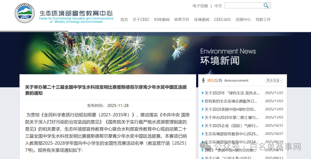 为贯彻《全民科学素质行动规划纲要(2021-2035年)》,推动落实《中共中央 国务院关于深入打好污染防治攻坚战的意见》《国务院关于实行最严格水资源管理制度的意见》的相关要求,生态环境部宣传教育中心联合水利部宣传教育中心现启动第二十三届全国中学生水科技发明比赛暨斯德哥尔摩青少年水奖中国区选拔赛。本赛项已纳入教育部2025-2028学年面向中小学生的全国性竞赛活动名单(教监管厅函〔2025〕7号)。现将有关事项通知如下: 主办单位: 生态环境部宣传教育中心 水利部宣传教育中心 支持单位: 赛莱默(中国)有限公司 比赛分为初中组(含小学5年级及以上)和高中组。初中组每个项目不超过3人,高中组每个项目不超过2人。 参赛作品须围绕水主题开展科学研究,并以项目报告形式提交。选题应聚焦于应对所在地、区域、国家乃至全球层面的水问题,或针对日常生活中的具体水难题,提出可验证、可推广的实践解决方案。研究过程需体现学生对跨学科知识的整合能力与创新应用思维,严格遵循实验验证、现场监测、数据分析等科学方法,并鼓励结合人工智能、大数据、物联网、仿生学、纳米技术等前沿科技,探索创新性的水问题解决路径。 往届全国中学生水科技发明比赛高中组一、二等奖获奖作品,可经指导教师完善提升并组建新项目团队后再次推荐,作品应重点说明延伸或更新内容及应用推广情况等,突出作品提升后与原作品的差异。 (一)省赛/地区选拔赛 1. 资格申报(2025年11月) 省赛应由各省级(包括计划单列市)生态环境相关部门、水利相关部门或省级教育部门所属相关机构牵头组织,可联合当地科协、共青团等部门共同举办。牵头部门应于2025年12月3日前将盖章申请表(见附件1)发至yuyaoqi@ceec.cn。往届省赛/地区选拔赛组织单位可申请延续举办并予以优先考虑。如出现多个牵头部门分别申报的情况,应在充分沟通后重新联合申报,并确定牵头单位。主办单位将择期公布省赛/地区选拔赛组织单位名单。未被列入名单的单位不得组织比赛。 2. 组织开展省赛/地区选拔赛(2025年12月-2026年3月) 3. 作品推荐与报送(2026年3月底) 由省赛/地区选拔赛组织单位向主办单位推荐优秀作品参加全国比赛的评选,推荐数量不超过本地所有参赛作品总数的20%,初中组推荐作品总数不超过15件,高中组不超过20件。 报送方式:2026年3月20日前,由各推荐单位登录网站(www.naturesch.cn)进行线上提交(示例见附件2、3)。报送作品须严格按照截止日期,逾期不得提交补录。 (二)全国比赛(2026年4-5月) 由主办单位组织评审专家对省赛/地区选拔赛推荐作品进行资格审查及评审,并组织决赛答辩、颁奖等活动。特等奖作品将被推荐参加2026年斯德哥尔摩青少年水奖活动。 (一)参赛作品 特等奖1个(仅限高中组) 一等奖、二等奖、三等奖、优秀奖若干。 (二)优秀指导教师:若干 (三)优秀组织单位:若干 具体奖项数量由组委会根据当年参赛作品数量和质量进行分配。 (一)比赛坚持公益性,不以营利为目的。比赛各项工作由主办单位及省赛单位直接负责实施,不向学生、学校收取成本费、工本费、活动费、报名费、食宿费、参赛材料费、器材费和其他各种名目的费用,做到“零收费”;不指定参与比赛活动时的交通、酒店、餐厅等配套服务;不通过面向参赛学生组织与比赛关联的培训、游学、冬令营、夏令营等方式,变相收取费用;不推销或变相推销资料、书籍、辅助工具、器材、材料等商品;不面向参赛的学生、家长或老师开展收费培训;不借比赛之名开展等级考试违规收取费用、不进行相关营销、促销活动。不以任何方式向学生或组织学生参赛的学校转嫁比赛活动成本。 (二)比赛坚持自愿原则,不强迫、诱导任何学校或学生参加比赛活动。对符合条件的学生平等开放。 (三)比赛及比赛产生的结果不作为中小学招生入学依据和高考加分项目,不得在高校招生中违规使用比赛结果。 (一)参赛作品须符合学生知识结构和实施能力,严禁弄虚作假、剽窃他人成果或采用不正当手段参赛,如有违反,经主办方核实后将取消其参赛资格。 (二)比赛规程和规则的解释权归生态环境部宣传教育中心所有。 (三)未尽事宜另行通知。 联系人:生态环境部宣传教育中心 于姚琦 颜莹莹 联系电话:010-84634281 电子邮箱:yuyaoqi@ceec.cn 联系人:水利部宣传教育中心 杨露茜 联系电话:010-63202238 附件1 省赛地区选拔赛申请表.doc 附件2 参赛登记表示例.docx 附件3 项目报告示例及撰写要求.docx 生态环境部宣传教育中心 水利部宣传教育中心 2025年11月28日